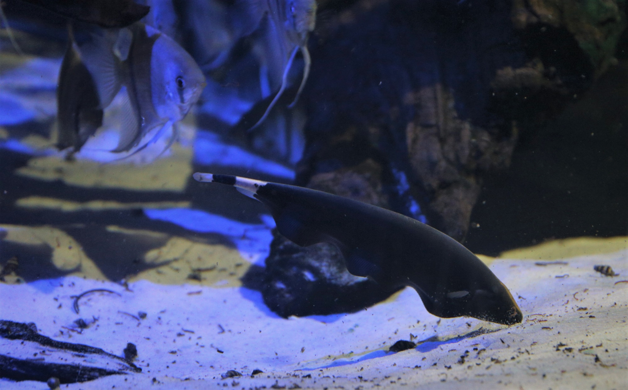 Рибки мають приблизно 10 см довжини і вже мають забарвлення, як у дорослих: чорне тіло з білими смужками на хвості та світлою смугою на голові. Під коренями та в напівтемряві павільйону їх не так легко знайти, але ми віримо, що терплячі відвідувачі їх помітять. Це справжні “чорні духи”, як і говорить їхня англійська назва — black ghost knifefish.