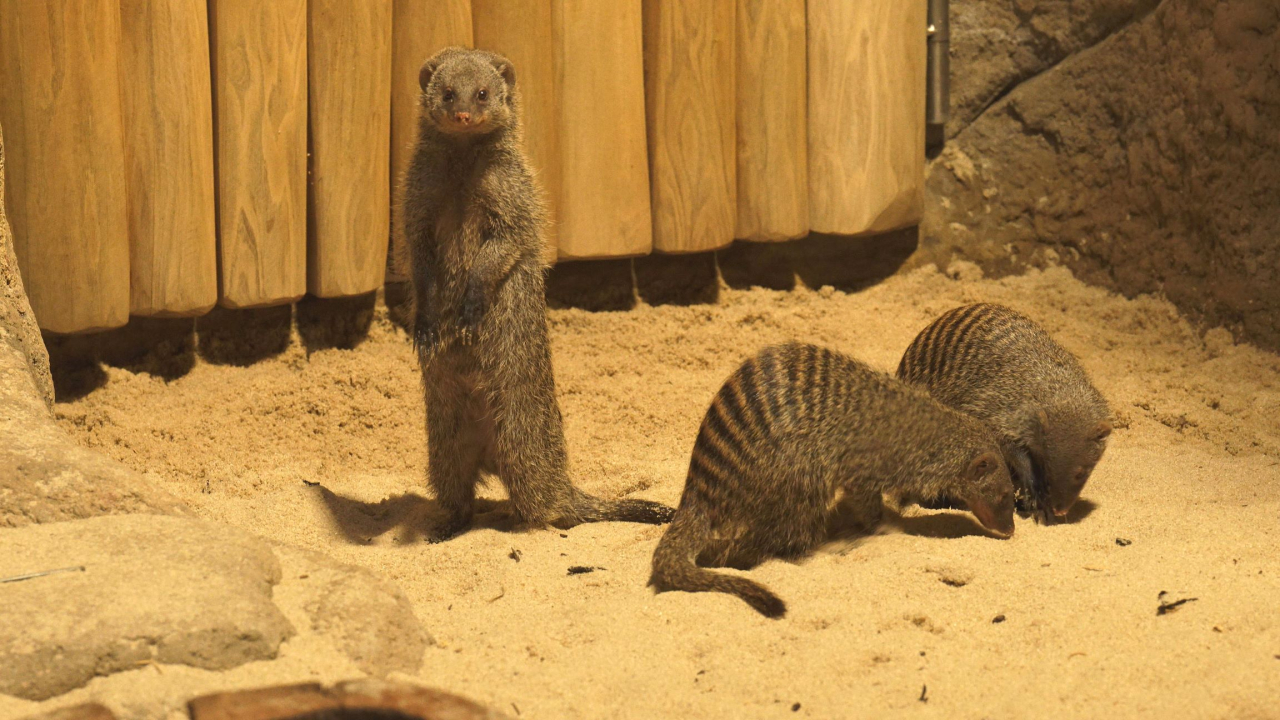 Zadní část pavilonu Tanganika po rekonstrukci obydlela skupina pěti samců mangust žíhaných. Koncem loňského roku se skupinu těchto šelem z čeledi promykovitých (Herpestidae) podařilo rozšířit o tři samice.Takový poměr pohlaví je typický i pro skupiny ve volné přírodě. Samotnému spojení však předcházela fáze seznamování. Jelikož jsou mangusty zvířata, která členy své skupiny rozeznávají primárně podle pachu, střídaly se obě skupiny ve vzájemných prostorách, kde měly přístup k podestýlce nebo substrátu používaného rezidentními zvířaty. Spojování samotné proběhlo velmi hladce a celá skupina, nyní čítající osm jedinců, funguje velmi dobře. Od začátku v ní dochází k velmi intenzivnímu páření. Mangusty tak výrazně oživují celou zadní část pavilonu Tanganika. Pokud by bylo páření úspěšné, první mláďata by se teoreticky mohla narodit již v dohledné době. Samice mangust jsou březí 60 až 70 dní a obvykle rodí od dvou do šesti mláďat. Na jejich odchovu se podílí i ostatní členové skupiny.