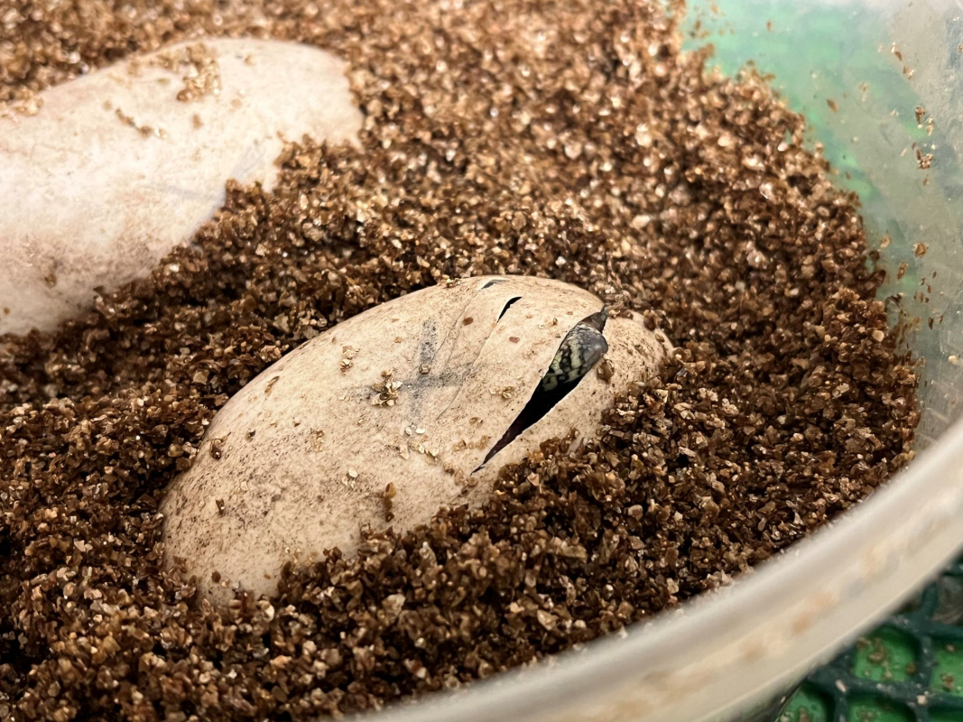 W drugiej połowie czerwca 2025 roku samica przestała przyjmować pokarm, ale sprawiła wrażenie „nadętej”. W pierwszym tygodniu lipca zaczęła przemierzać ekspozycję i grzebać w podłożu w poszukiwaniu odpowiedniego miejsca do złożenia jaj. Dlatego samca przeniesiono do zaplecza. W końcu 14 lipca samica tym samym miejscu co w poprzednim roku wykopała wykopła gniazdo o głębokości 1 m. Tylko w gnieździe o odpowiedniej głębokości, temperaturze i wilgotności może dojść do prawidłowego rozwoju jaj. 5 jaj o długości 7,5 cm i masie około 66 g opiekunowie umieścili w wylęgarni. W dniach 25 i 26 stycznia 2026 r. wykluły się 2 młode warany papuaskie o masie 50 g. Trzy jaja nie rozwijały się prawidłowo.