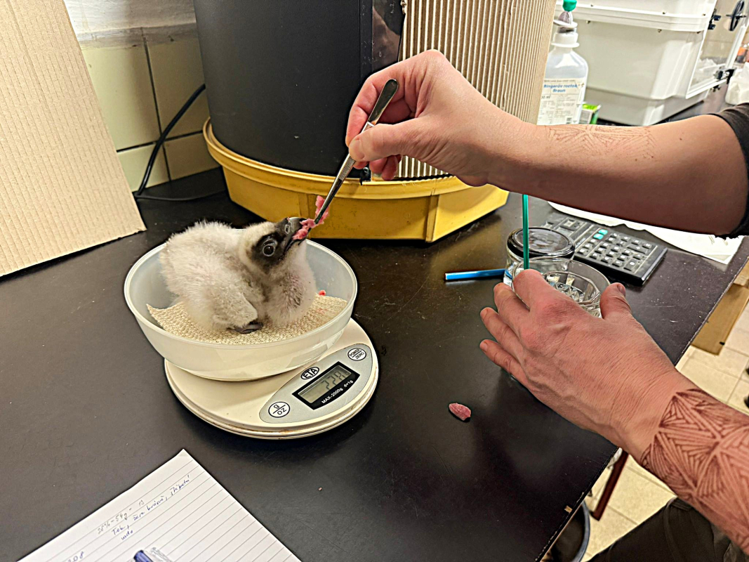 Pierwsze pisklę wykluło się 11 lutego. Następnego dnia opiekunowie obserwowali karmienie. Dzięki kamerze, która nieustannie monitoruje gniazdo, pilnują tylko, aby rodzice ogrzewali pisklę i dostarczali mu pożywienie. Resztę pozostawiają im samym. Na razie niezbędna była tylko jedna interwencja. Szóstego dnia opiekunowie umieścili z powrotem malucha, który wysunął się z zagłębienia gniazda i groziło jego wyziębienie, ponieważ rodzice mu nie potrafili pomóc.